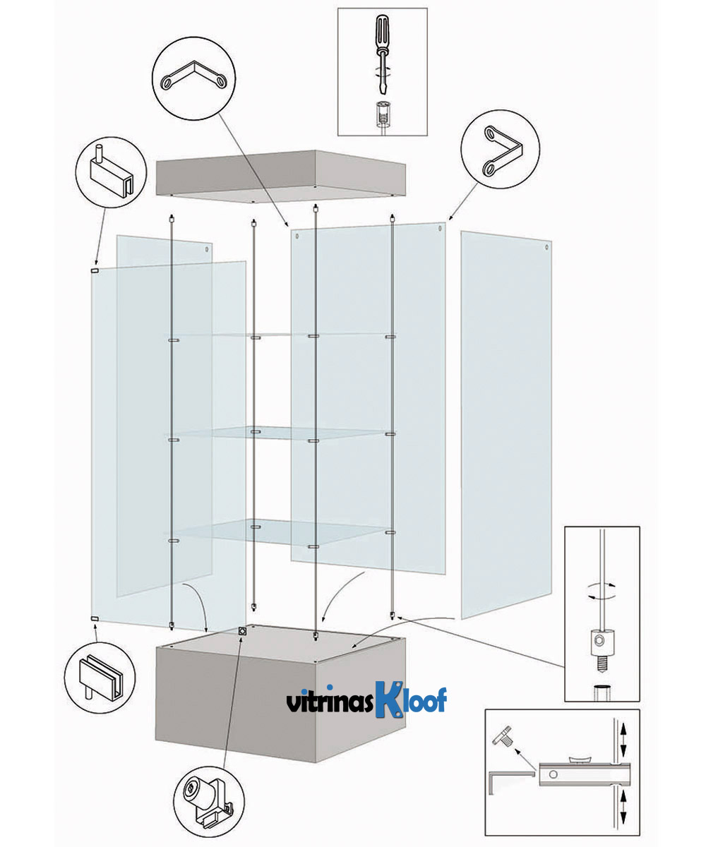 La estructura de vidrio templado de 8 m/m se completa con tres estantes graduables, que ofrece flexibilidad para organizar los objetos. Es desmontable para un transporte práctico y se puede personalizar a petición con colores, tamaños y accesorios adicionales.